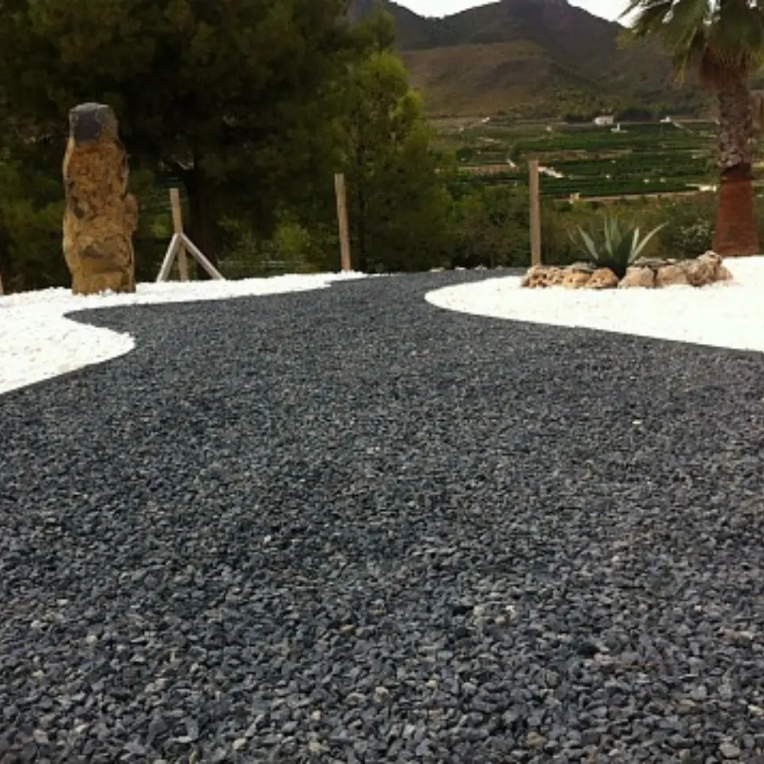 Gravilla negra en saco de 25 kg, ideal para decoración de jardines, senderos y exteriores. Ofrece un acabado elegante, resistente y fácil de mantener.
