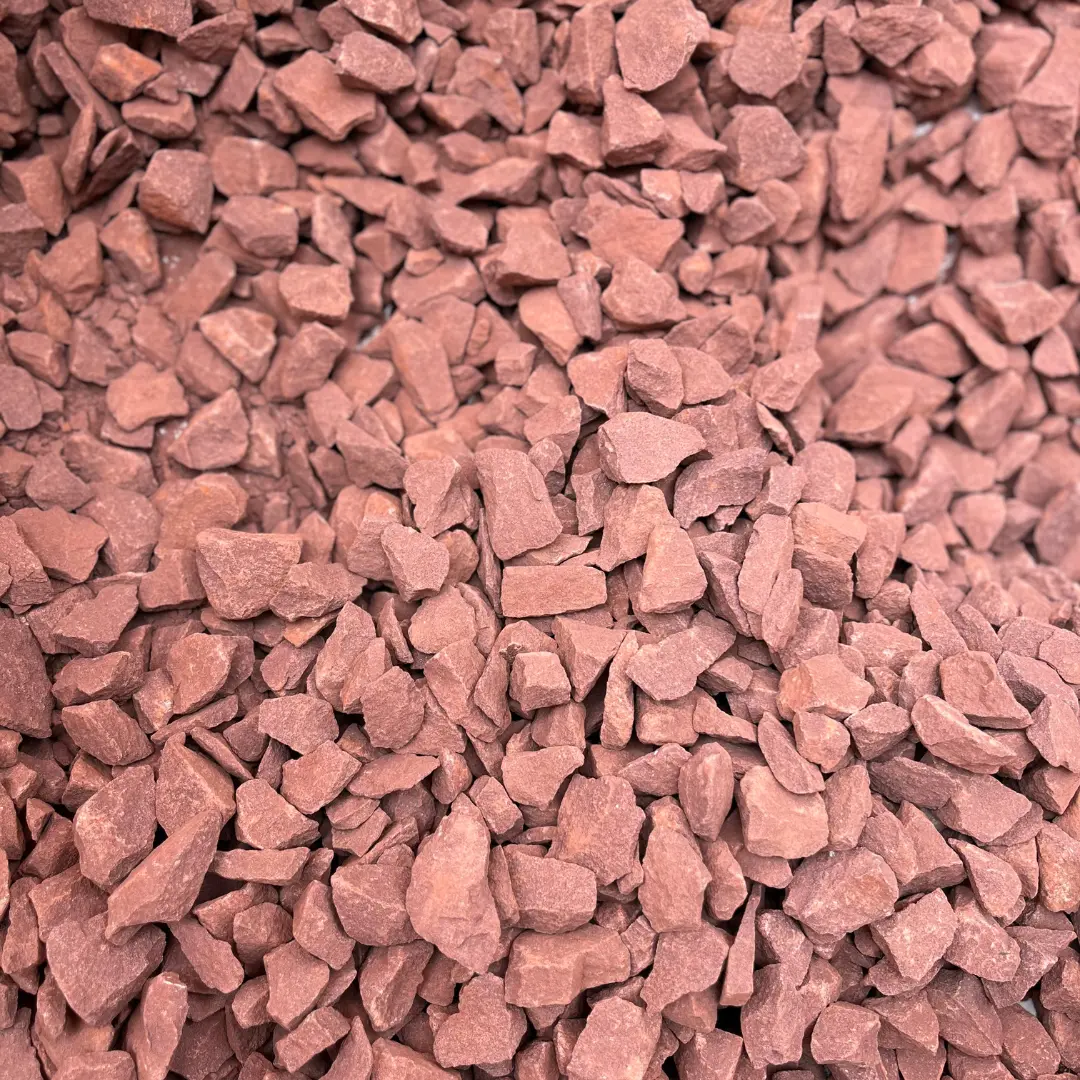 Gravilla decorativa roja almendra en saco de 25 kg, ideal para jardinería, paisajismo y decoración de exteriores. Ofrece un acabado estético y duradero, fácil de aplicar y mantener.